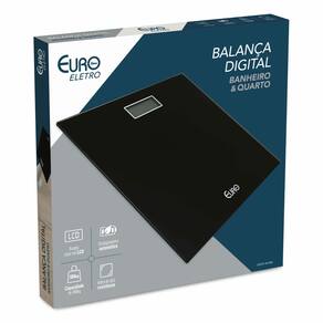 Especificações técnicas: - Cor: Preto - Marca: Euro Eletro - Modelo: BAL7894-PT - Material: vidro temperado / ABS / Aço - Capacidade máxima: 180kg - Capacidade mínima: 2,5kg - Unidades de medida: kg ou libras - Vidro de alta resistência - Amplo visor em LCD