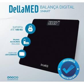 ESPECIFICAÇÕES TÉCNICAS Marca: Dellamed; Modelo: Balança Digital Corporal Smart - Cor Preta; Auto desligamento em 10 segundos; Altura do solo: apenas 20 mm. Dimensões do produto: Largura: 28 cm Comprimento: 28 cm Altura: 2 cm; Display amplo de 70 x 29 mm; Peso do Produto: 900g; Classificação Fiscal: 8423.10.00; Certificação Anvisa: 80795950001; Produto com certificação do INMETRO;