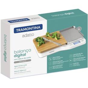 Características: Marca: Tramontina Código do Fabricante: 61101010 Linha: Adatto Cor: Branco Material: Polipropileno Material da Tábua: Madeira (Bambu) Material da Bandeja: Aço inox Capacidade Máxima: 5Kg Função de Tara: Sim Acompanha Pilhas: Não
