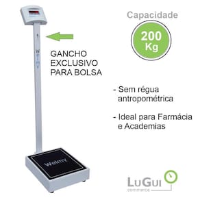 Balança Farmácia Digital W200 / 200kg 100g Welmy Modelo W 200/100 Capacidade 200 kg Carga Mínima 2 Kg Divisão 100 g Dimensão 34 x 39 cm Display com 06 dígitos em: LED vermelho ou LCD com backlight; Teclado membrana em policarbonato de alta resistência; Função: TARA até a capacidade máxima da balança; Fonte de alimentação externa de 90 a 240 VAC com chaveamento automático Bivolt ; Consumo: 08 VA; Plataforma e coluna de aço carbono. Base em aço carbono, acabamento bicromatizado; Pés reguláveis em borracha sintética; Tapete antiderrapante; Antropômetro em alumínio anodizado e litografado com medida de: até 2 metros com fração de 0,5 cm; Entrada para bateria 12VCC externa, apenas para balanças sem bateria interna; Pintura: Epóxi na cor branca. Homologada pelo INMETRO e aferida pelo IPEM. Opcionais: Saída de dados RS 232 para computador; Kit adaptador RS 232 para USB. Peso bruto: 12,400 kg - Peso Liquido: 10,900 kg Altura cm : 125 Largura cm : 35 Comprimento cm : 51 Volume m : 0,2231 Marca: Não Informado