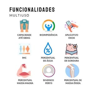 Balança Inteligente Bioimpedância Bluetooth App de Celular Com a Balança de Bioimpedância, você tem acesso a diversos indicadores de saúde diretamente em sua casa, sem precisar gastar com exames caros. Com tecnologia avançada e um aplicativo integrado, você monitora seus dados corporais em tempo real, de forma prática e acessível. Funcionalidades: A balança permite o monitoramento de 13 indicadores essenciais para ajudar você a manter um estilo de vida mais equilibrado e saudável: - Peso Corporal: Monitoramento preciso do seu peso atual. - IMC Índice de Massa Corporal : Avaliação do seu peso em relação à altura. - Percentual de Gordura Corporal: Taxa de gordura no corpo em porcentagem. - Peso Corporal Sem Gordura: Estimativa do peso corporal descontando a gordura. - Gordura Subcutânea: Percentual de sob a pele. - Índice de Gordura Visceral: Avaliação da gordura ao redor dos órgãos. - Percentual de Água Corporal: Proporção de água presente no corpo. - Massa Muscular: Registro do peso dos músculos em quilogramas. - Massa Muscular Esquelética: Proporção de músculos esqueléticos em relação ao peso corporal. - Massa Óssea: Peso dos ossos em quilogramas. - Taxa de Proteína: Percentual de proteína no corpo. - Metabolismo Basal: Quantidade de calorias que seu corpo queima em repouso. - Idade Corporal: Indicação da idade metabólica com base no seu metabolismo basal. Além disso, gráficos detalhados no aplicativo ajudam a acompanhar sua evolução ao longo do tempo, fornecendo uma visão clara do seu progresso e auxiliando na conquista de suas metas de saúde. Fácil de Usar: Especificações Técnicas: - Dimensões: 26,5 cm x 26,5 cm x 3 cm; - Material: Metal e vidro temperado de 5 mm; - Cor: Preto; - Alimentação: 2 pilhas AAA incluídas ; - Compatibilidade: iOS e Android; - Conexão: Bluetooth; - Visor: LCD com leitura clara e precisa; - Cadastro de Usuários: Suporta até 24 perfis no aplicativo. Itens Inclusos: - 1x Balança de Bioimpedância; - 2x Pilhas AAA; - 1x Manual do Usuário. Homologação Inmetro: CE-BRI/IDEAL 00132/22-01 Marca: Não Informado