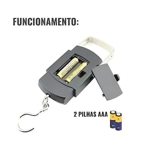Características: - Display de 4 dígitos com números grandes para melhor leitura - Possui gancho feito em aço inoxidável para pesagem - Desligamento automático após 2 minutos ou manualmente - Botão: ON/OFF - Função: Tara autocalibração - Pesa em escalas de kg,lb,jin,oz - Fonte de alimentação: 2 Pilhas AAA inclusas - Visor digital medindo aproximadamente: 3,2 cm x 2 cm - Medidas aproximadas da argola: 3 cm de diâmetro - Medidas aproximadas do gancho: 5 cm de comprimento - Medidas aproximadas do produto: 10 cm x 5,5 cm x 2 cm - Material: Plástico ABS, Gancho de aço inoxidável. - Capacidade: 50 kg