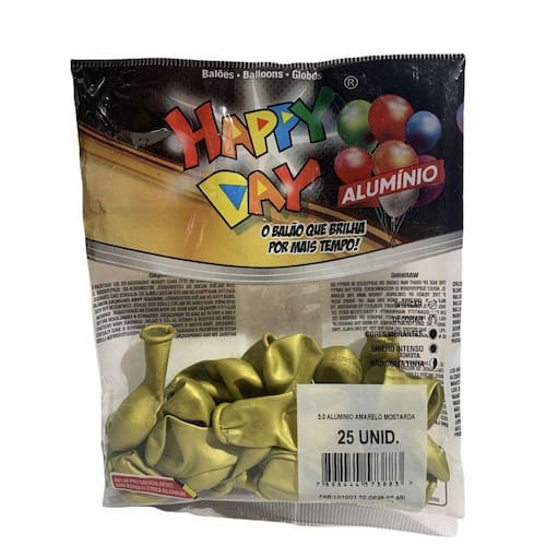 Descrição: Balão Happy Day Alumínio Amarelo Mostarda nº 5 Balão não pode faltar na festa, deixe sua decoração mais divertida, use a criatividade e faça decorações fantásticas!!! Indicado para arranjos de balões e arcos desconstruídos. Material: Látex Tamanho: Aproximadamente 12 cm A embalagem contém 25 unidades. Marca: Happy DayO efeito alumínio metalizado permite que ela fica brilhante e refletindo a luz na sua superfície.O Balão pode ser cheio utilizando a boca mas é altamente indicado a utilização de infladores manuais ou compressores com baixa pressão para inflar os balões e deixarem eles ainda melhor cheios.Imagem meramente ilustrativa Ean: 7898444573883