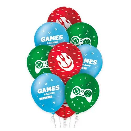 Características: Balões: de cor azul, verde e vermelho detalhes de game, tamanho 9. Contém 25 vinte e cinco unidades. Biodegradável. Ideal para gás hélio. Dica: após inflar o balão esvazie um pouco 10 a 15% o ar antes do nó, garantindo assim sua maior durabilidade na decoração.