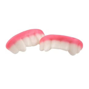 No pacote contém dentaduras nas cores rosa e branco com sabor de morango e framboesa.