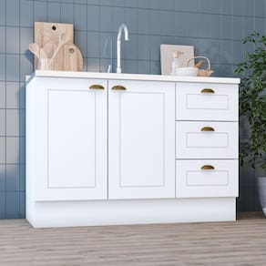 FICHA TÉCNICA: Acabamento: Pintura UV Texturizada Cor Interna: Trama Branco Escala de Brilho: Fosco Qtd. Portas: 3 Und. Tipo Porta: Bater Material da Porta: MDF Material do Puxador Porta: Metal Zamac Material da Dobradiça: Metálica 35mm com Amortecimento Qtd. Gavetas: 3 Und. Material da Gaveta: MDF Material do Puxador Gaveta: Metal Zamac Peso Máximo por Gaveta: 3 KGs Material da Corrediça: Corrediça Telescópica Qtd. Prateleiras: 1 Und. Material da Prateleira: MDF Peso Máximo por Prateleira: 3 KGs Qtd. Pés: 0, Possui rodapé Material Pés/Rodapé: MDF Pés Reguláveis: Não Altura Pés/Rodapés: 5 Cm Acompanha Tampo: Não Possui vidro: Não Material Principal: MDF Material do Fundo: MDF Pode ser montado suspenso: Sim Produto Suporte até (Kg): 40 Kg Peso Produto Montado (Kg): 40 Kg Medidas Montado (A x L x P): 82 x 120 x 51 Cm Informações Complementares: Com Divisor de Talheres, Montagem Flex (Montagem Direita/Esquerda) e Puxadores em ZamacCor: Branco HP