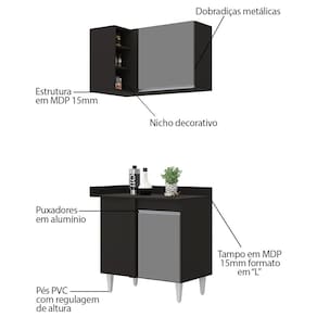 Características do Produto Material da Estrutura: MDP 15 mm. Material do Fundo: MDF 3 mm. Peso Suportado: Balcão: 28 Kg distribuídos/ Armário: 20 Kg distribuídos. Acompanha Tampo: Sim. Acabamento: Melamina BP. Escala de Brilho: Fosco. Quantidade de Portas: 2 Portas. Material da Porta: MDP. Possui Gavetas: Não. Tipo de Puxador: Alumínio. Possui Prateleiras: Sim. Quantidade de Prateleiras: 2 Prateleiras. Material da Prateleira: MDP. Montagem Flex: Pode ser montado em ambos sentidos, com o nicho para esquerda ou direita. Possui Pés: Sim. Tipo de Pés: PVC. Diferenciais: - Design moderno. - Pode ser montado do lado esquerdo ou direito. Sistema de Montagem: Cavilhas/Parafusos. Manual de Montagem: Sim. Complexidade da Montagem: Média. Volumes: 2 Volumes. Conteúdo da Embalagem: 1 Armário aéreo, 1 Balcão. Garantia do Fabricante: 90 dias contra defeito de fabricação. Montagem: Recomendamos que seja feita por um profissional. Recomendação de Limpeza: Utilize pano úmido.
