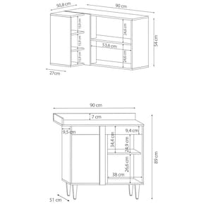 Dimensões do Produto (L x A x P) Armário: 90 cm x 54 cmx 29 cm. Balcão: 90 cm x 89 cm x 51 cm. Peso: 54 Kg.