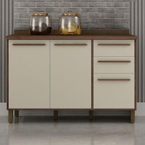 Informações complementares: Material: MDP 15mm Acabamento: Pintura UV Ambiente: Cozinha Prateleiras: 1 MDP Nichos: Não Vidros: Não Espaço para garrafas: Não Bandeja para talheres: Sim Gavetas: 2 MDP Tipo de puxador da gaveta: Externo Tipo da corrediça da gaveta: Metálica Telescópica Material do puxador da gaveta: MDF envelopado Portas: 3 MDP Tipo de porta: Bater Tipo de puxador da porta: Externo Tipo de dobradiça da porta: Metálica de pressão Material do puxador da porta: ABS Tampo para trabalho 1200x530 -LxP- Pés: 6 Material do pé: Plástico Pés niveladores: Sim