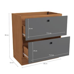 Fechando ótimas combinações com o aéreo do mesmo tamanho, o balcão pode ser montado com tampo ou pedra, e para um melhor acabamento, ele conta com rodapé, mas acompanha as ferragens para ser montado suspenso, e se você preferir, também pode adquirir os pés separadamente, garantindo muita praticidade. Versátil e indispensável, medindo 88cm de altura, 80cm de largura e 52cm de profundidade, são dois gavetões, permitindo organizar panelas, potes e outros itens com facilidade, e para o máximo de durabilidade, conta com corrediças telescópicas, que permitem a abertura total, com um melhor aproveitamento de espaço e resistência.