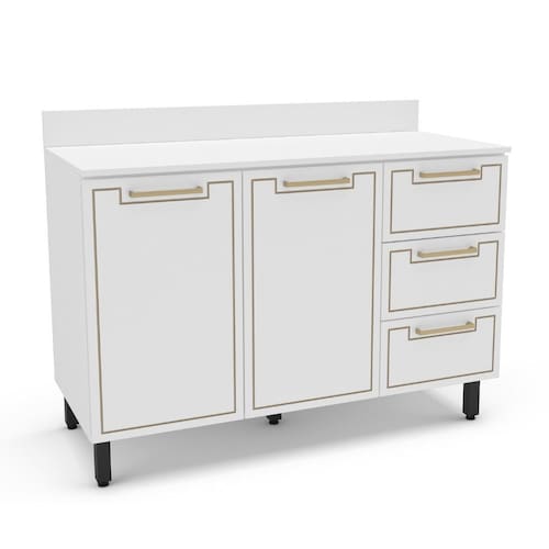 O Balcão Amara da Politorno, com tampo, 2 portas e 3 gavetas, une funcionalidade e estilo contemporâneo. O tampo reforçado amplia a superfície de trabalho para o preparo de receitas, enquanto a estrutura em MDP/MDF assegura robustez e longa vida útil. A pintura FF/UV oferece proteção contra umidade e facilita a limpeza diária. As gavetas, apoiadas em corrediças telescópicas, deslizam suavemente e garantem acesso rápido aos utensílios. Detalhes usinados acrescentam toque de elegância, e o amplo espaço interno valoriza qualquer cozinha, mantendo tudo organizado.