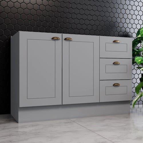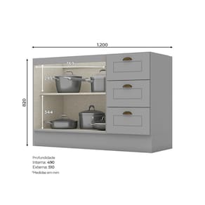 O Balcão 02 Portas 03 Gavetas da Linha Internacional Henn é super versátil, foi projetado para proporcionar praticidade e funcionalidade. Pode ser utilizado em vários ambientes, se adequa tanto à espaços maiores, quanto os mais compactos. Medidas (AxLxP): 82x120x51cm. Sua estrutura é 100% MDF, material de excelente qualidade que suporta variações de temperatura. As portas possuem dobradiças de 35 mm com amortecimento, garantindo um fechamento suave e evitando que elas batam. As gavetas têm corrediças telescópicas, que permitem o deslizamento firme e silencioso. Acompanha um divisor de talheres. Os puxadores de metal zamac, na cor ‘Ouro Velho’, criam uma harmonia entre o clássico estilo provençal e o industrial. Opção de instalação sem pés, suspensa (ferragens para fixação na parede inclusas). Suporta Granito: Sim Acabamento da Prateleira: Pintura UV Escala de Brilho da Prateleira: Fosco Acabamento da Gaveta: Pintura UV Escala de Brilho da Gaveta: Fosco Material do Puxador da Gaveta: Metal Acabamento da Porta: Pintura UV Escala de Brilho da Porta: Fosco Material do Puxador da Porta: Metal Acabamento: Pintura UV Acabamento dos Pés: Pintura Acompanha Tampo: Não Altura dos Pés: 14,5 cm Ambiente Principal: Cozinha Balcão Acompanha Pia: Não codigo_ean: 7909903284834 Complexidade da Montagem: Média: pode ser montado por mais de uma pessoa e/ou necessite de maior conhecimento para montagem Cor: Cinza Cor do Pés: Branco Cor do Produto: Cinza Cor Flex: Não Escala de Brilho: Fosco Gaveta com Chave: Não Informações Complementares: O produto pode ser montado para os dois lados, direito e esquerdo. As portas têm dobradiças de 35mm com amortecimento que garantem um fechamento suave e evitando que elas batam. As gavetas têm corrediças telescópicas, que permitem a abertura total e o des Itens Inclusos: 1 Balcão, Kit Ferragens e Manual de Montagem Linha ou Coleção: Internacional Manual de Montagem e Instalação: https://product-hub-prd.madeiramadeira.com.br/831487/documents/8a09d4d3-982f-4076-a3d6-cf18d96366aeaopia03gaveta02portassandy.pdf Material da Dobradiça/Corrediça da Porta: Metálica Material da Gaveta: MDF Material da Porta: MDF Material da Prateleira: MDF Material dos Pés: MDF Montagem Flex: Sim Necessita Montagem: Sim O Balcão Acompanha Pia: Não Origem do Produto: Nacional Pés Reguláveis: Não Peso: 40 kg Peso Máximo por Gaveta: 3 kg Peso Máximo por Prateleira: 8 kg Possui Pés: Rodapé Possui recorte para Cooktop: Não Recomendações de Uso, Manutenção e Limpeza: Para limpeza de seu móvel, use uma flanela seca ou umedecida. Não utilize produtos químicos que possam danificar o produto. Sapatas Niveladoras: Sim Sistema de Montagem: Parafusos e Cavilhas Suporta Até (kg): 25 kg Tipo de Corrediça da Gaveta: Telescópica Tipo de Dobradiça/Corrediça da Porta: Soft close Tipo de Porta: Bater Tipo de Puxador da Gaveta: Externo Tipo de Puxador da Porta: Externo