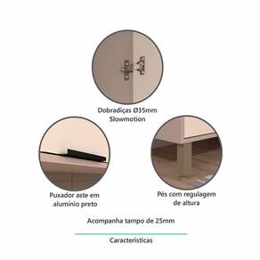 Caracteristicas Estrutura: MDP 15mm Acabamento da Caixaria/Corpo: PF Acabamento das Portas/Frontal: BP Quantidade de Portas: 1 de Abrir Tipo de Dobradicas: Metalicas 35mm Slow Motion Quantidade e Tipo de Puxadores: 1 Puxador em Aluminio Preto Quantidade de Prateleiras: 1 Tipo do Tampo: MDP 25mm com acabamento BP Com Rodatampo: Sim, em MDP 15mm, acabamento BP e 6cm de altura Sistema de Montagem: Cavilhas e parafusos. Garantia do Fabricante: 3 meses Itens inclusos: Balcao com tampo, manual de montagem, ferragens e acessorios.