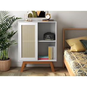Balcao Alto Aparador Buffet Com Porta De Correr Rattan Pés Em Madeira Branco