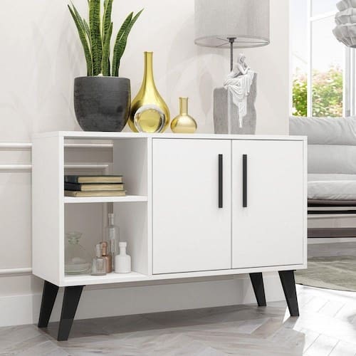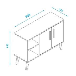 Quanto à funcionalidade e organização, o Balcão Buffet é composto por 2 portas com dobradiças metálicas e 2 prateleiras, uma interna e outra externa com amplo espaço para guardar as louças de jantar e objetos de decoração.