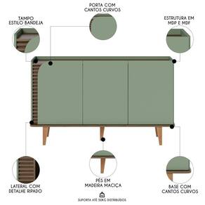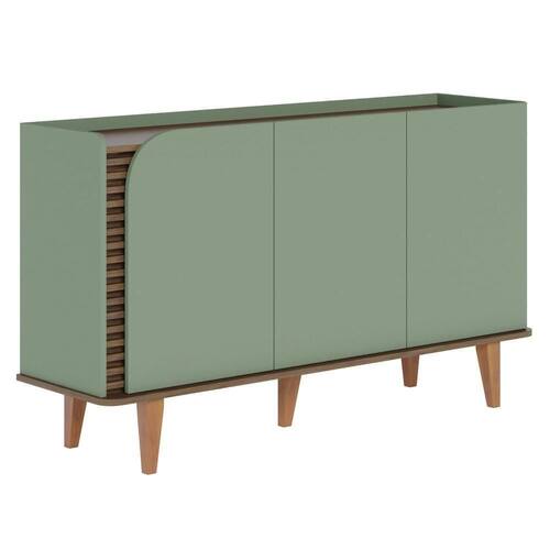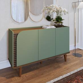 Encante-se com o Balcão Aparador Buffet 3 Portas 136m Madrid C05 Hortelã/Amêndoa, da Mpozenato, uma combinação perfeita de design retrô e contemporâneo expressos em cada detalhe. Os pés de madeira maciça harmonizam facilmente com as linhas orgânicas, com o aplique ripado e com a porta de quina usinada, adicionado um conferem um visual único e sofisticado ao móvel. Já o tampo amadeirado, levemente recuado, cria a sensação de uma bandeja, agregando um charme especial ao buffet.
