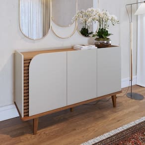 Encante-se com o Balcão Aparador Buffet 3 Portas 136m Madrid C05 Off White Matte/Freijó, da Mpozenato, uma combinação perfeita de design retrô e contemporâneo expressos em cada detalhe. Os pés de madeira maciça harmonizam facilmente com as linhas orgânicas, com o aplique ripado e com a porta de quina usinada, adicionado um conferem um visual único e sofisticado ao móvel. Já o tampo amadeirado, levemente recuado, cria a sensação de uma bandeja, agregando um charme especial ao buffet.