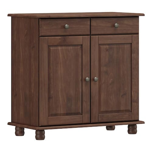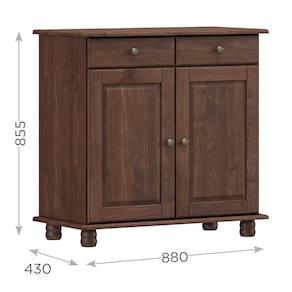 O Balcão Aparador Rubi da Finestra Móveis combina elegância e funcionalidade, sendo fabricado com estrutura em madeira maciça de pinus de reflorestamento e acabamento em pintura acetinada com verniz PU e UV. Conta com duas portas equipadas com dobradiças com amortecimento e prateleiras internas em madeira maciça que suportam até 10kg distribuídos. Possui ainda duas gavetas com corrediças telescópicas e capacidade para até 5kg cada, oferecendo amplo espaço para organização. Os puxadores metálicos em ouro envelhecido e os pés torneados em madeira maciça acrescentam um charme clássico ao design, tornando a peça ideal para salas de jantar, estar ou halls de entrada.