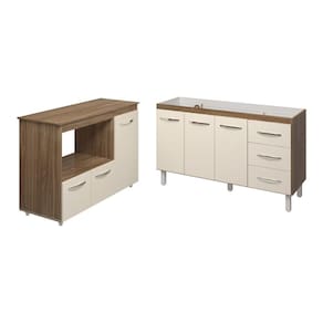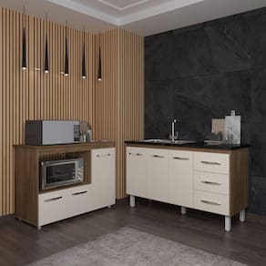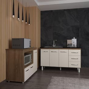 Balcão Armário Cozinha Carine Gabinete De Pia 140 Cm E Balcão Lilian Para Forno Elétrico E Microondas Savana Off White Transforme sua cozinha com o Kit Balcão para Pia 140 cm Carine e Balcão para forno elétrico e microondas Lilian. Confeccionado com materiais resistentes e acabamento UV refinado, esse conjunto oferece o equilíbrio perfeito entre beleza e funcionalidade. Deixe sua cozinha organizada e moderna com um design inteligente que valoriza o ambiente, garantindo praticidade e elegância no seu dia a dia! Características do Balcão de Pia Carine 138 cm: Altura: 83,5 cm (com pés) | 67 cm (sem pés) Largura: 138 cm (padrão para pia de 140 cm) Profundidade: 50 cm Material: MDP (madeira) Portas: 3 Gavetas: 3 Prateleiras: 1 Puxadores: 6 plásticos cromados Pés: 6 reguláveis de plástico (altura: 16,5 cm, ajustáveis até 18 cm) Corrediças: Metálicas Acompanha tampo: Não Indicação de Uso: Cozinha