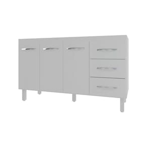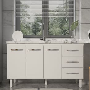 Altura com pés: 83,5 cm Altura sem pés: 67 cm Largura: 138 cm (Compatível com pias de 140 cm) Profundidade: 50 cm Material: MDP (Madeira de Média Densidade) Portas: 3 portas Gavetas: 3 gavetas Prateleiras: 1 prateleira interna Puxadores: 6 puxadores plásticos cromados Pés: 6 pés de plástico reguláveis Altura dos pés: 16,5 cm Regulagem dos pés: Ajuste máximo até 18 cm, apenas para nivelamento Corrediças: Metálicas Uso recomendado: Cozinha Nota: A imagem é ilustrativa. O produto não inclui tampo, pia ou objetos decorativos. Apenas o balcão está à venda.