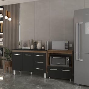 Balcão Armário Gabinete Bruna 118 Cm Savana Preto Com Tampo Preto E Balcão Amanda Para Forno E Microondas Savana Preto Transforme sua cozinha com este kit prático e elegante! Composto pelo balcão Bruna de 120 cm com tampo, ideal para armazenamento e apoio no preparo de refeições, e pelo balcão Amanda para Forno e Micro-ondas, que proporciona uma instalação segura e organizada. Seu design moderno, materiais resistentes e acabamento sofisticado garantem funcionalidade e beleza para um ambiente mais aconchegante e eficiente. Características do Balcão de Pia Bruna 118 cm: