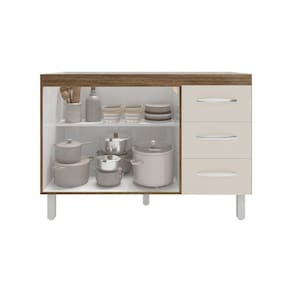 Os puxadores plásticos cromados conferem um toque elegante, complementando o design sofisticado. Os pés reguláveis garantem a estabilidade do móvel em qualquer superfície, enquanto as prateleiras proporcionam amplo espaço para armazenar seus utensílios de cozinha.
