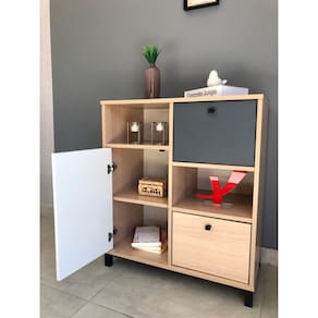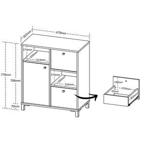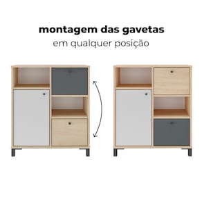 - Estrutura em MDP 15mm com fita de borda ABS com 0,45mm de espessura; - Puxadores em metal; - Uma porta em MDP 15mm com fita de borda ABS 0,45mm de espessura; - Prateleira interna móvel com três regulagens de altura; - Duas gavetas com corrediças metálicas, fundo encaixado em MDF 3mm - Frente em MDP 15mm com fita de borda ABS com 0,45mm de espessura; - Fixação com tambor, minifix e parafuso. - Capacidade de carga: 10kg distribuídos no tampo, 5kg distribuídos na prateleira; 10kg distribuídos na base, 5kg distribuídos em cada gaveta.
