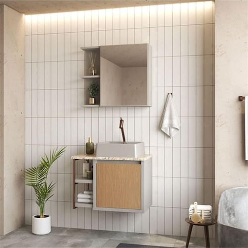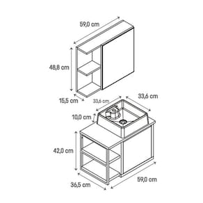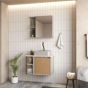 O Conjunto Tâmisa eleva o estilo e a funcionalidade do seu banheiro. A espelheira ampla possui prateleiras internas e externas para organizar seus itens de cuidados pessoais. O gabinete apresenta uma cuba de design inovador, combinado com cores modernas para um visual sofisticado. As prateleiras laterais e a estrutura de ferro adicionam um toque de estilo industrial-chique, oferecendo mais espaço para toalhas, produtos de limpeza ou decorações. Um móvel versátil e elegante que se destaca na decoração do ambiente.