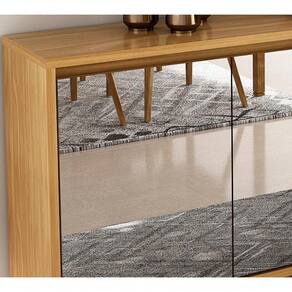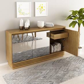 Balcão Buffet BB2609. Cheio de elegância e requinte, este balcão irá ser destaque em sua sala de jantar. Possui estrutura em MDP de 15mm, já o tampo, as laterais, a base e as portas são de 25mm de espessura, pintura com acabamento em Uv (Fosco). Conta com 03 portas articuladas com espelhos proporcionando um visual sofisticado, possui 03 dobradiças metálicas em cada porta garantindo maior resistencia e durabilidade, 01 gaveta interna com corrediças metálicas e laterias de 25mm de espessura, 01 prateleira interna que suporta até 10 kg, com design super atual a base conta com aplique decorativo super elegante, e um amplo espaço interno, que acomoda louças, copos e utensílios para auxiliar naqueles momentos de confraternização, o tampo também é um grande aliado, pois apoia desde itens decorativos até bandejas com as melhores receitas para aquelas refeições em família. Este móvel chegará na sua casa separado em 02 volumes.