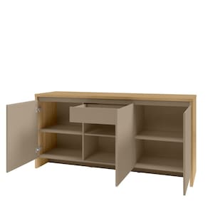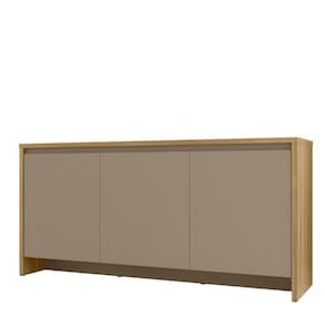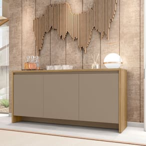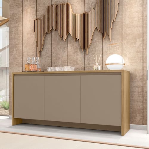 O Buffet Madrid contém design moderno com amplo espaço interno para acomodar objetos. Contém portas usinadas em MDF de 15mm com puxador em cava, além de dobradiças metálicas e sistema soft close. Internamente, possui 6 nichos e 1 gaveta com corrediças telescópicas. O rodapé contém sapatas protetoras evitando que o móvel risque o piso. Sua pintura conta com acabamento Print Wood.