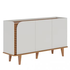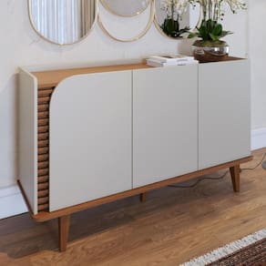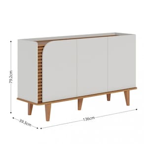 Características: Estrutura em MDP e MDF 3 Portas Detalhe ripado Bases e laterais com cantos curvos Pés em madeira maciça