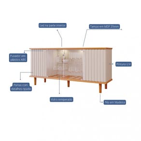 Características: 2 Portas em vidro temperado 2 com detalhe ripado 4 Pés em madeira Acabamento em laca e pintura U.V Estrutura em MDF LED na parte interior Puxador em plástico ABS Tampo em MDF 25mm