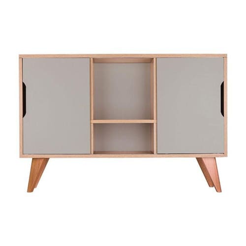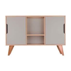 Possui dois compartimentos internos com 2 portas laterais e uma prateleira central visível para colocar objetos de decoração. Móvel apoiado em quatro lindos pés torneados em madeira maciça.