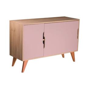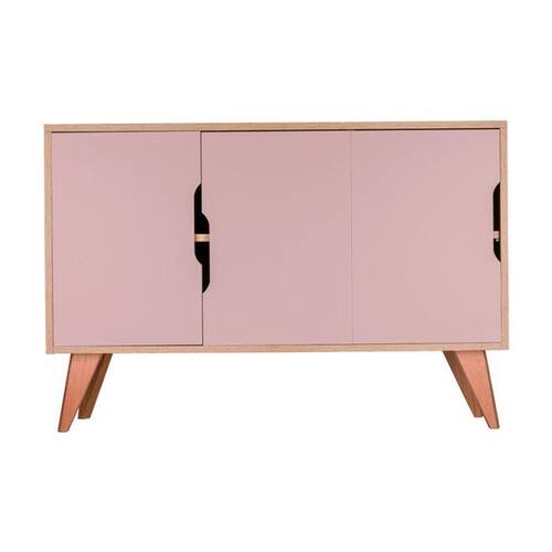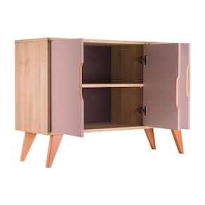 Possui dois compartimentos internos divididos por uma prateleira e 3 portas cor Rosa Claro, conjunto apoiado em lindos pés torneados em madeira maciça.