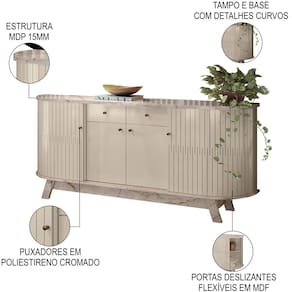 Com um design que combina os estilos clássico e moderno, esse balcão aparador conta com amplo espaço interno para que você possa armazenar diversos itens de jantar, como louças, pratarias, kits de mesa posta, dentre outras coisas. O diferencial está no desenho exclusivo das portas laterais flexíveis, que correm no trilho seguindo as curvas do móvel, um charme de tirar o fôlego. Demais não é mesmo?
