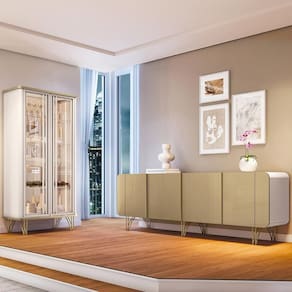 O Balcão Buffet conta com quatro portas com sistema de amortecimento e puxadores em alumínio dourado. O espaço interno é ideal para guardar louças e utensílios.