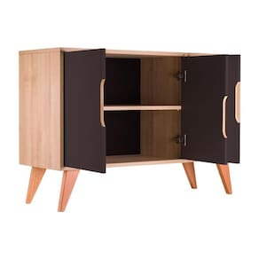 Possui dois compartimentos internos divididos por uma prateleira e 3 portas cor Grafite, conjunto apoiado em lindos pés torneados em madeira maciça.