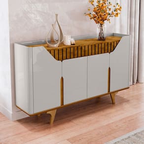 O(a) Balcão Buffet Tamisa 4 Portas Ripado Off-White/Naturalle - Móveis Bechara é produzido em MDF na escala de brilho Brilhante e Fosco, e possui um grau de dificuldade de montagem: Médio.