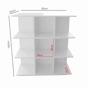 Dimensões: Comprimento: 90 cm Largura: 60 cm Altura: 100 cm Com nichos internos medindo 28 cm de comprimento, 29 cm de profundidade e 30 cm de altura, cada compartimento é projetado para acomodar objetos de diferentes tamanhos, permitindo uma organização personalizada.