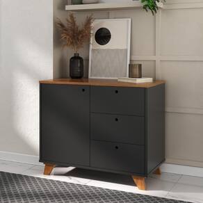 Ela possui um design marcante, com Tampo, Laterais e Base em MDP 18mm. Possui uma porta com prateleira interna com regularem, três gavetas com deslizamento suave.