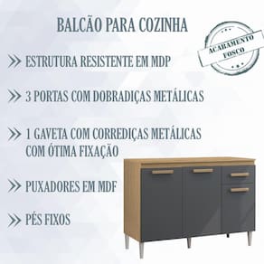 Balcão De Cozinha Com Tampo, ideal para quem busca modernidade e praticidade. Estrutura em MDP de 12mm e 15mm proporcionando resistência e durabilidade. Contando com acabamento em verniz, este acabamento garante manter a beleza constante do móvel, resistência e durabilidade, prolongando a vida útil do produto. Composto por 03 portas articuladas com dobradiças metálicas dando maior durabilidade ao abrir e fechar, 01 gaveta ampla com corrediças em metal para melhor deslize, puxadores em MDF com design moderno e resistente, acompanha tampo 120 cm e 05 pés em PVC. Produto com amplo espaço interno para organizar os utensílios domésticos com total praticidade e funcionalidade do dia a dia, ideal para compor sua cozinha da forma que desejar. Este móvel chegará em sua casa separado em 01 volume.