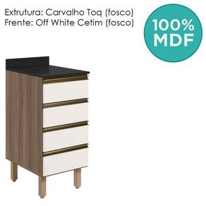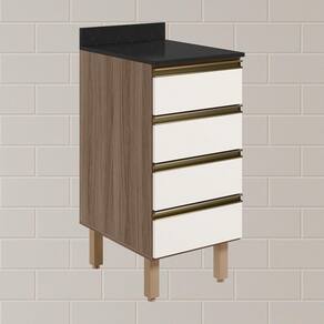 Balcão com tampo funcional e compacto para composições modernas. Com 40cm de largura, fabricado 100% em MDF, possui estrutura e tampo de 15mm, com forro de 3mm. Conta com 4 gavetas com corrediças telescópicas e puxadores em perfil alumínio. Os 4 pés possuem altura de 15,5cm com regulagem adicional de 1,5cm, garantindo estabilidade em qualquer piso. Este móvel chegará em sua casa separado em 3 volumes.