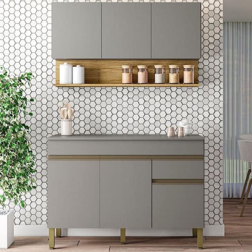 Balcão Com Tampo e Armário Aéreo para quem busca praticidade na organização da cozinha. Produzido em MDP (15mm) com acabamento em pintura UV texturizada. Conta com 06 portas (portas superiores com sistema passante), 01 gaveta, 01 nicho inferior, dobradiças e corrediças metálicas e 01 prateleira interna. Os pés reguláveis são em plástico resistente e os puxadores em perfil alumínio (pintura epóxi). Este produto será entregue em 04 volumes.