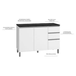 O Balcão 3 portas 2 gavetas sem tampo para cuba Evidence da Poliman Móveis é o produto ideal para quem procura praticidade e beleza, pode ser sozinho ou como complemento da cozinha modelo Evidence, um produto versátil, possui amplo espaço interno bem distribuído em 03 portas de bater, 02 gavetas com corrediças telescópicas que permitem abertura total, puxadores perfil em alumínio dando um charme todo especial ao produto, dobradiças de aço, ideal para pia 120cm (não acompanha tampo/cuba, vendidos separadamente), estrutura em MDP, pintura UV, pés reguláveis de acordo com o piso que conferem firmeza e resistência ao móvel.