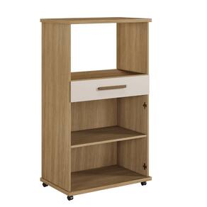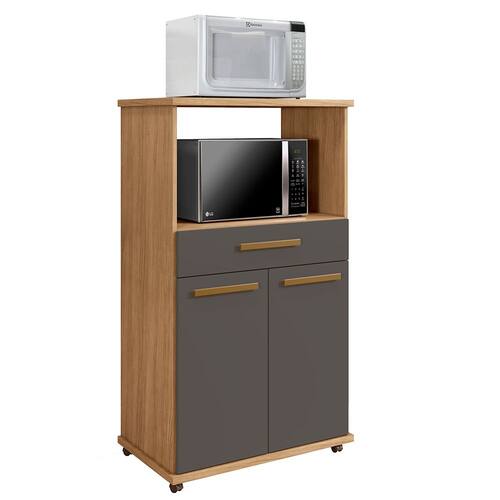 Perfeito para diversos ambientes, O Balcão Conquista é ideal para organizar sua cozinha com praticidade, versatilidade e beleza. Possui espaço para Micro-ondas e Forno Elétrico, 2 portas com dobradiças metálicas, ampla gaveta, prateleira interna e rodízios para facilitar a locomoção, tudo isso para garantir mais facilidade no seu dia a dia. Desenvolvido para combinar com qualquer decoração, ele torna o ambiente mais bonito e funcional.\nEspecificalções do Produto Montado: Altura: 128 cm Largura: 73 cm Profundidade: 45 cm Peso: 37 Kg\nGarantia: 3 meses Número de Portas: 02 Número de Gavetas: 01 Número de Prateleiras: 01 Rodizio incluso: Sim.\nAtenção:\nNão oferecemos serviço de montagem, mas todos os  produtos possuem manual de montagem com o passo a passo. Recomendamos contratar um profissional de montagem. Pode existir diferença de tonalidade entre a foto e o produto devido ao tratamento da imagem e à calibração de cores do monitor Itens que decoram o ambiente nas imagens não acompanham o produto.