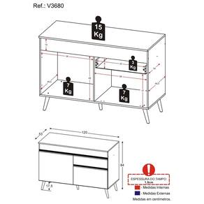 Dimensões do produto montado: Altura: 84cm | Largura: 120cm | Profundidade: 53cm (balcão com tampo) *Você pode consultar as medidas internas na imagem técnica do produto.