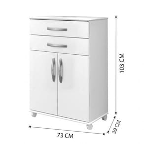 - Cor: Branco; - Estrutura: MDP e MDF; - Acabamento: Pintura UV Fosco; - Medidas: 103cm (A) x 73cm (L) x 39cm (P); - Peso: 28,5 kg; - Possui Gaveta: 2; - Possui Porta: 2; - Possui Prateleira: 1; - Suporta Até (kg): 48 kg; - Necessita Montagem: Sim; - Complexidade da Montagem: Média - pode ser montado por mais de uma pessoa e/ou necessite de maior conhecimento para montagem; - Itens Inclusos:1 Balcão, Kit ferragens e Manual de Montagem.;