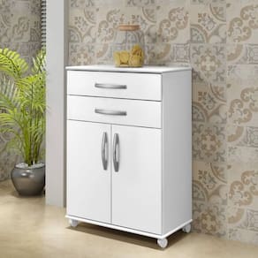 Balcão Cozinha 2 Portas 2 Gavetas Mônaco Arte Móveis Branco O Balcão Mônaco é perfeito para diversos ambientes e funcionalidades. Utilize para organizar sua cozinha, área de serviço, etc. Com este produto prático e versátil, projetado para dar trazer mais beleza ao seu ambiente com comodidade e qualidade. O produto possui 2 portas com dobradiças metálicas, 2 gavetas amplas, prateleira interna e rodízios para facilitar a locomoção, tudo isso para garantir mais facilidade no seu dia a dia. Este balcão foi desenvolvido para combinar com qualquer decoração, deixando o seu ambiente mais bonito e funcional.\nMEDIDAS\nAltura 103 cm\nLargura 73 cm\nProfundidade 39 cm\nCARACTERÍSTICAS\nModelo Mônaco\nTipo do produto Balcão Cozinha\nAmbiente Cozinha\nMaterial MDP / MDF\nQuantidade de Portas 02\nTipo de Porta Bater\nQuantidade de Gavetas 02\nTipo de Gaveta Externa\nAcabamento Pintura U.V.\nQuantidade de Prateleiras 01\nPossui Rodízios Sim\nFabricante Arte Móveis\nEscala de Brilho Semi-brilho\nTipo de Puxador Cromado\nCorrediça/Dobradiça Metálica\nNecessita Montagem Sim\nAcompanha Manual de Instalação Sim\nINFORMAÇÕES IMPORTANTES\nObjetos decorativos que porventura apareçam na foto, não acompanham o produto. Não nos responsabilizamos pela montagem/instalação dos produtos.\nMontagens, desmontagens e instalações são responsabilidades do cliente. Indicamos que contrate uma empresa de montagem ou um montador de sua confiança.\nAlém disso, favor verificar se os pés e acessórios estão dentro do forro inferior do produto. Em suma, todas as informações divulgadas sobre o produto são de responsabilidade do Fabricante.\nAs cores do produto podem variar de acordo com o seu monitor, a iluminação do ambiente em que você está e até mesmo a sua percepção visual. Além da cor, pequenos detalhes e acabamentos podem não ficar evidentes na foto, por isso as imagens são meramente ilustrativas.