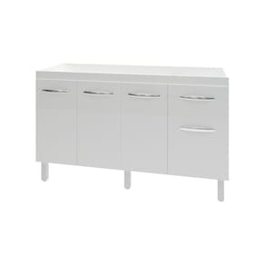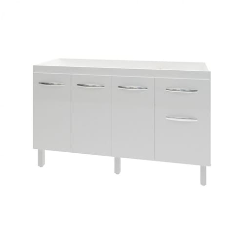 Altura com pés: 83,5 cm Altura sem pés: 67 cm Largura: 138 cm (Padrão para pia de 140 cm) Profundidade: 50 cm Material: MDP (Madeira de Média Densidade) Portas: 4 portas Gavetas: 1 gaveta Prateleiras: 1 prateleira Puxadores: 6 puxadores plásticos cromados Pés: 6 pés reguláveis de plástico Altura dos pés: 16,5 cm Regulagem dos pés: Ajuste máximo até 18 cm, apenas para nivelamento Corrediças: Metálicas Indicação de uso: Cozinha Nota: A imagem é meramente ilustrativa. O produto não acompanha tampo, pia ou objetos decorativos. Apenas o balcão está incluído.