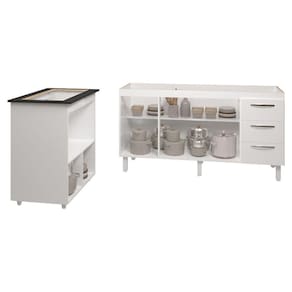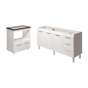 Balcão Cozinha Armário Gabinete De Pia 160 Cm Estela E Balcão Para Fogão Cooktop 5 Bocas Evelyn Branco Conheça o Kit Balcão Gabinete para Pia Estela 160 cm + Balcão para Cooktop Evelyn, a combinação perfeita de espaço, modernidade e praticidade para sua cozinha! O Balcão Estela oferece 160 cm de largura, proporcionando amplo espaço de armazenamento com design elegante e puxadores cromados que dão um toque especial ao ambiente. Produzido em MDP, ele garante durabilidade e estilo. Já o Balcão Evelyn é ideal para otimizar o espaço, com nicho para cooktop de 5 bocas e forno elétrico, além de 2 portas frontais para organizar utensílios e itens essenciais do dia a dia. Características do Balcão de Pia Estela 157 cm: Altura: 83,5 cm (com pés) | 69 cm (sem pés) Largura: 157 cm (ideal para pia de 160 cm) Profundidade: 50 cm Material: MDP (madeira) Portas: 3 Gavetas: 3 Prateleiras: 1 Puxadores: 6 plásticos cromados Pés: 6 reguláveis de plástico (altura: 16,5 cm, ajustáveis até 18 cm) Corrediças: Metálicas Tampo incluído: Não Indicação de uso: Cozinha